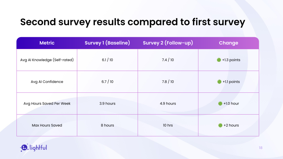 Result: measurable time savings across multiple teams and sustained adoption of AI in day-to-day work.