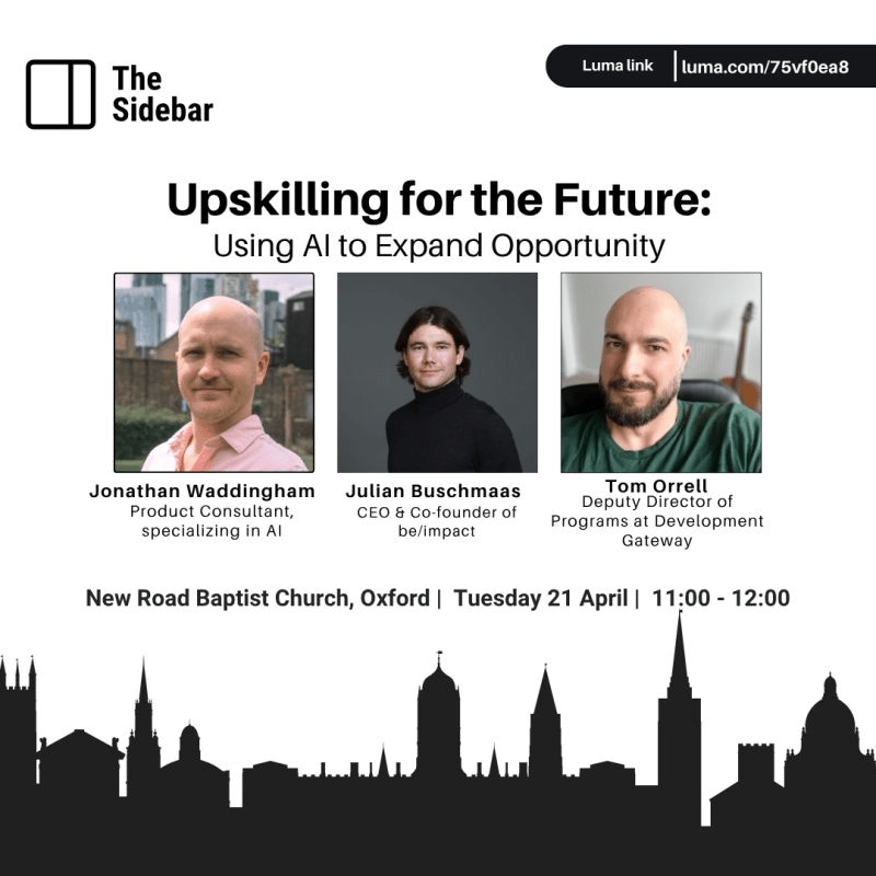 I’ll be around all week (I have the advantage of living in Oxford), and co-leading at at least one Sidebar event, like Upskilling for the Future: Using AI to Expand Opportunity.